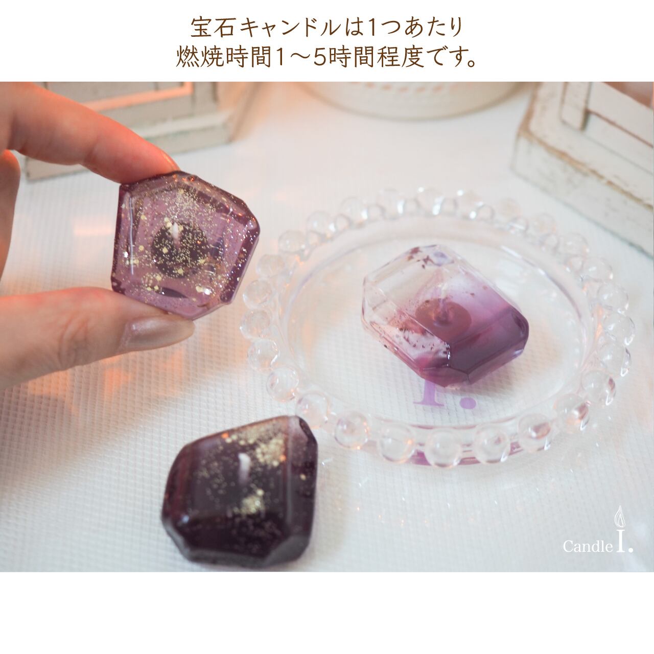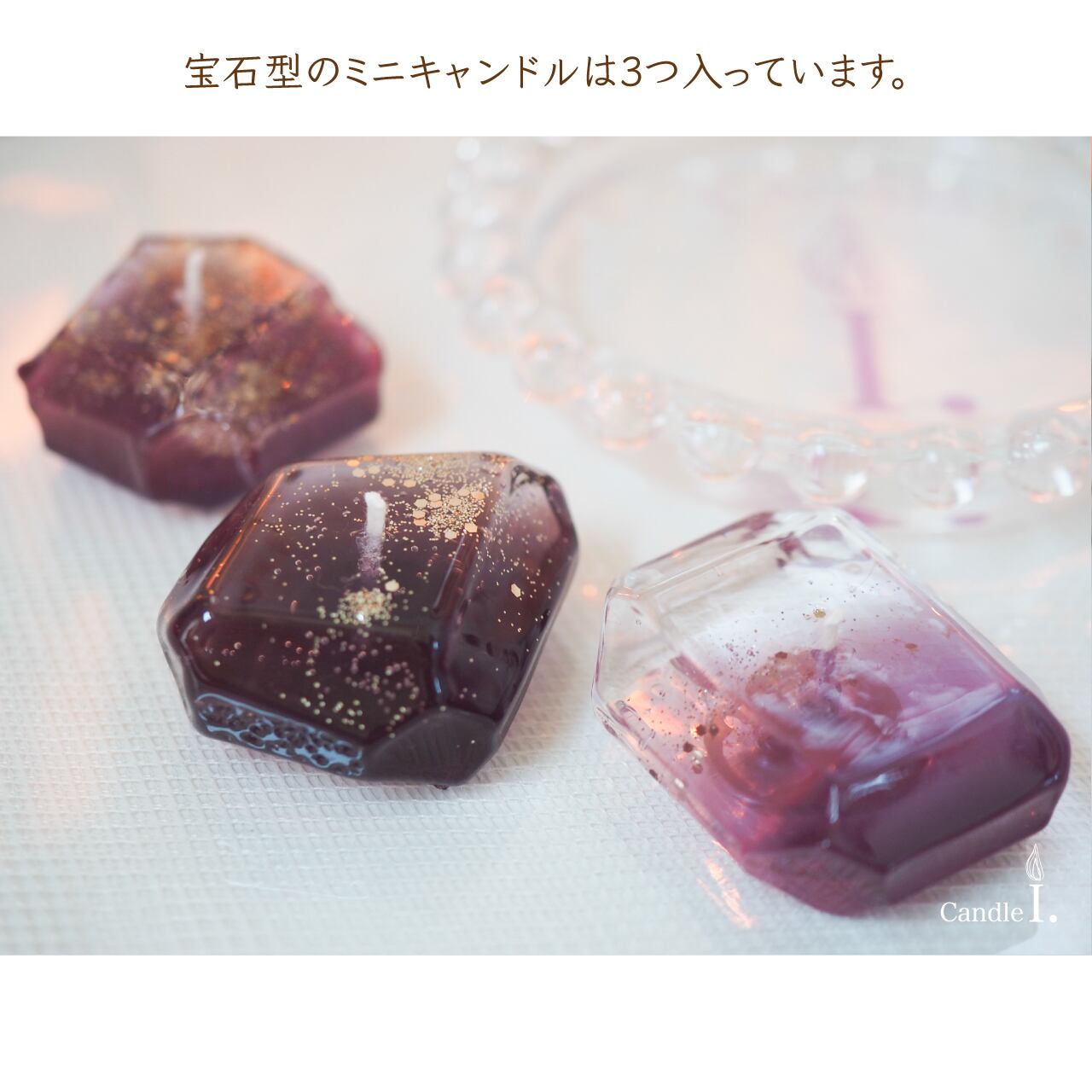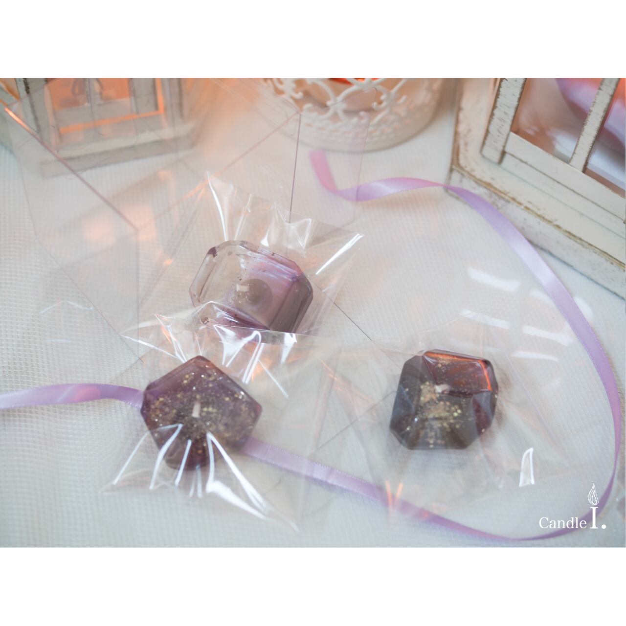 透明ぷにぷになジェルワックスを使用して、宝石型にカットしたミニサイズのキャンドルを3つセットにしています。小さいですが燃焼時間は1〜5時間程度と長持ちします。