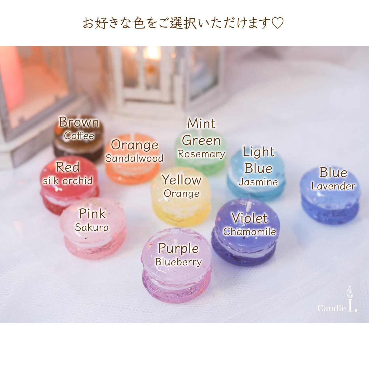 マカロンを2つ、お選びいただけます。推しカラーで選んでいただいても、お好みの香りで選んでいただいても♡