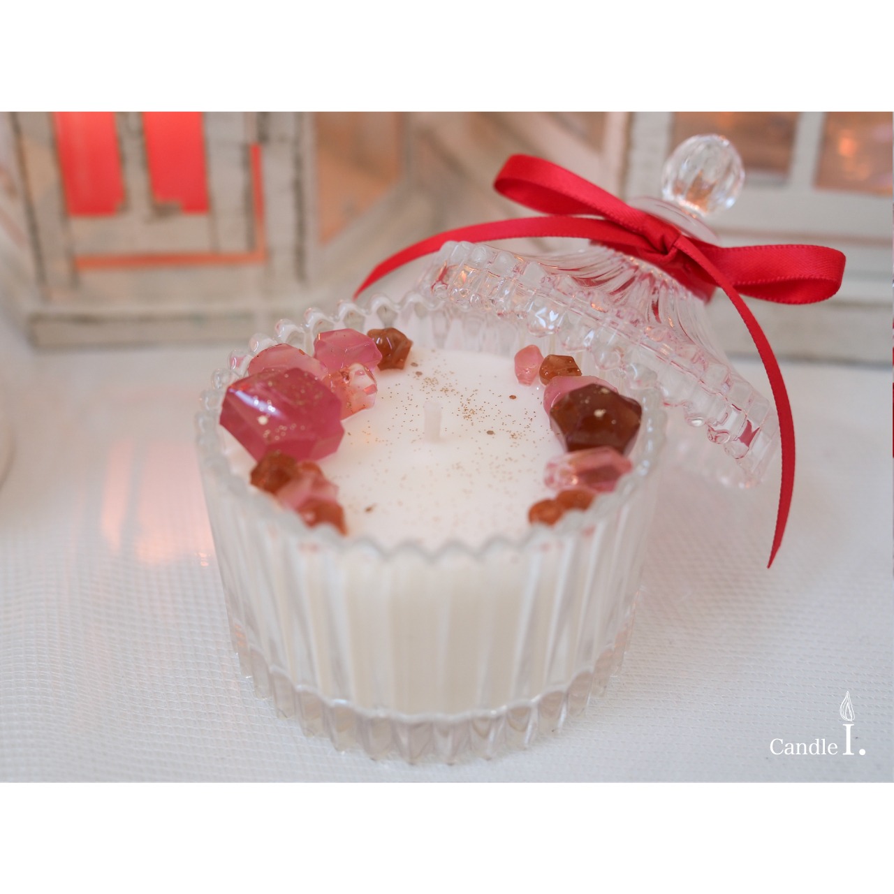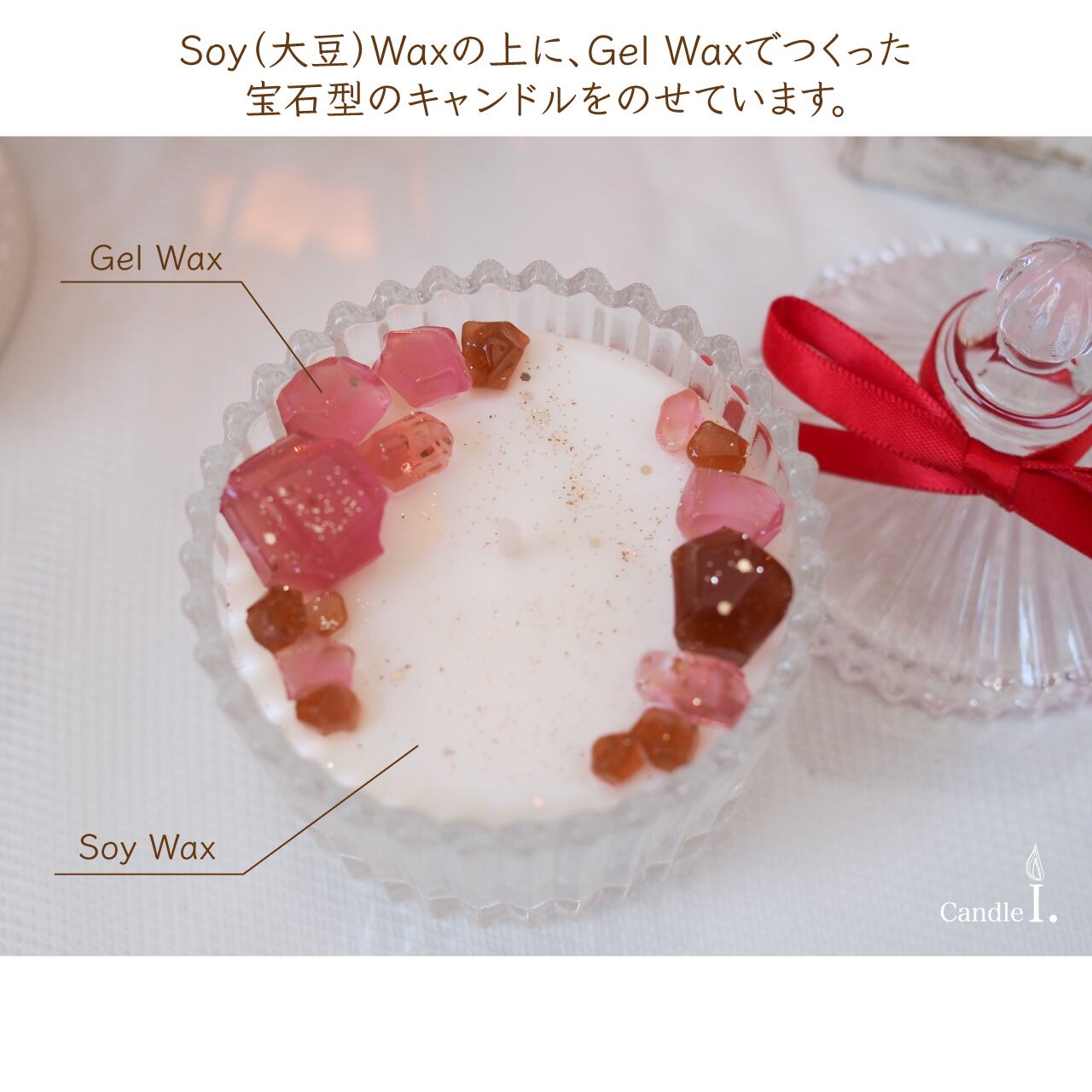 ソイ(大豆)ワックスを使用した天然素材のロウの上に、小さな宝石をイメージしたジェルワックスを飾ってみました。