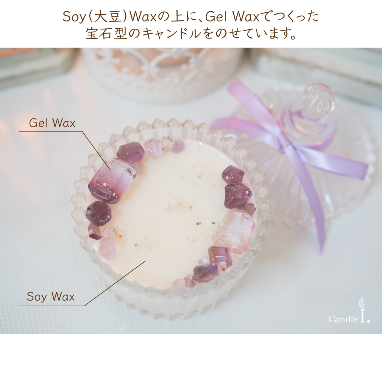 ソイ(大豆)ワックスを使用した天然素材のロウの上に、小さな宝石をイメージしたジェルワックスを飾ってみました。