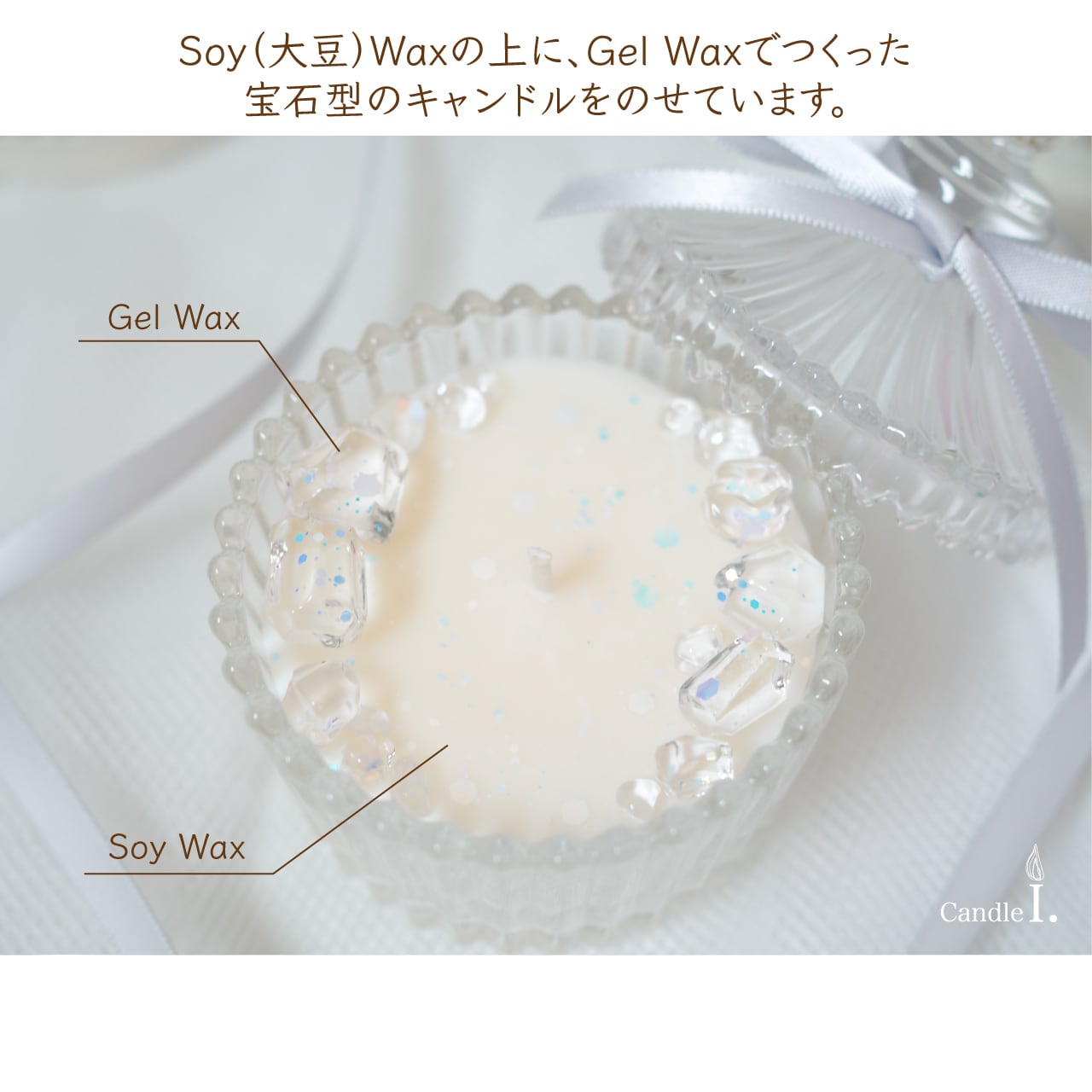 ソイ(大豆)ワックスを使用した天然素材のロウの上に、小さな宝石をイメージしたジェルワックスを飾ってみました。キャニスター入りなので、火を消した後は蓋をして次のキャンドルタイムまで保管ができます。