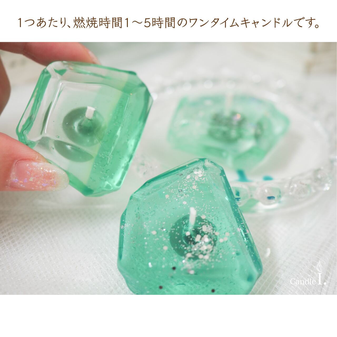 透明ぷにぷになジェルワックスを使用して、宝石型にカットしたミニサイズのキャンドルを3つセットにしています。小さいですが燃焼時間は1〜5時間程度と長持ちします。